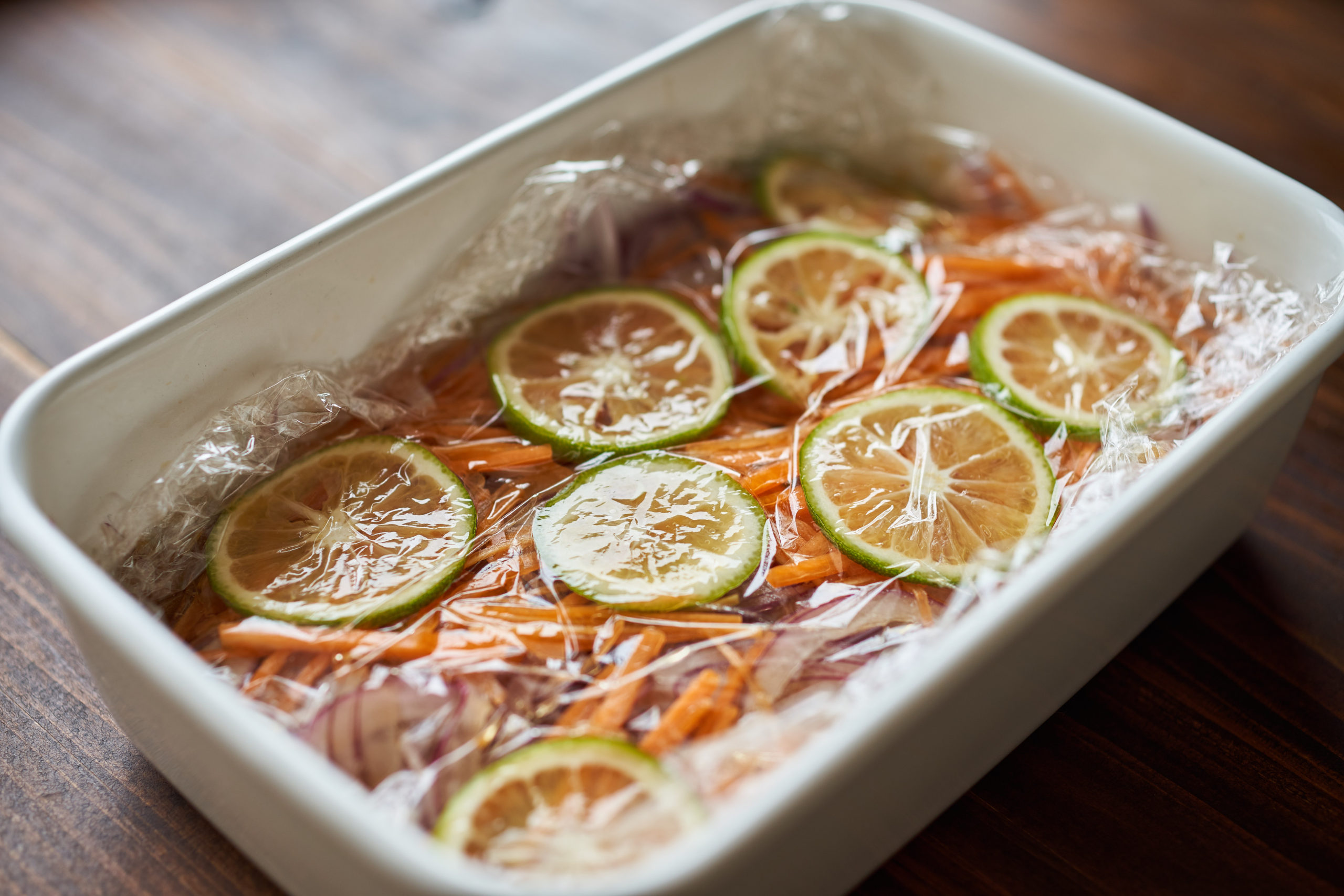 保存容器に紫玉ねぎ、にんじん、かぼすをのせてラップを敷き込む。