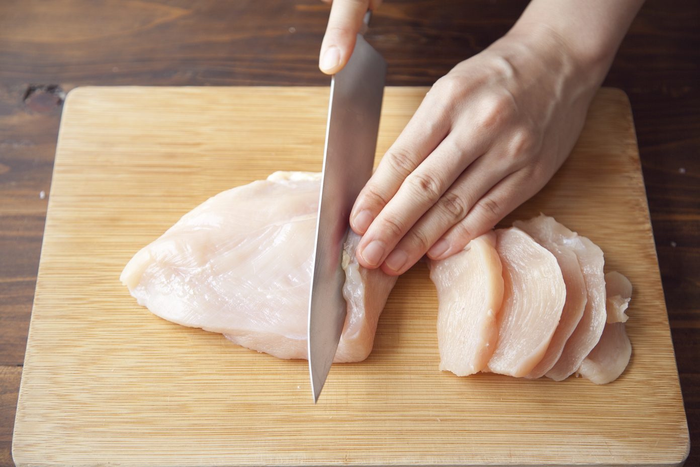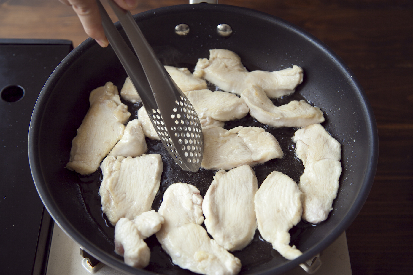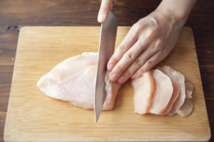 鶏むね肉はそぎ切りにし、薄力粉を薄くまぶす。
