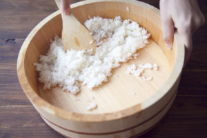 熱いごはん300g に合わせ酢(米酢小さじ4、砂糖小さじ2 強、塩小さじ1 弱)を混ぜ合わせ、ぬれ布巾をかけておく。