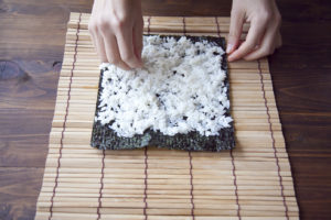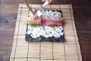 巻くとすし飯がぎゅっと締まるため、海苔がすける程度に薄めに敷きます。)