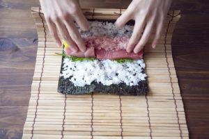 すし飯の端と端を合わせるように巻きすでしっかりと巻く。