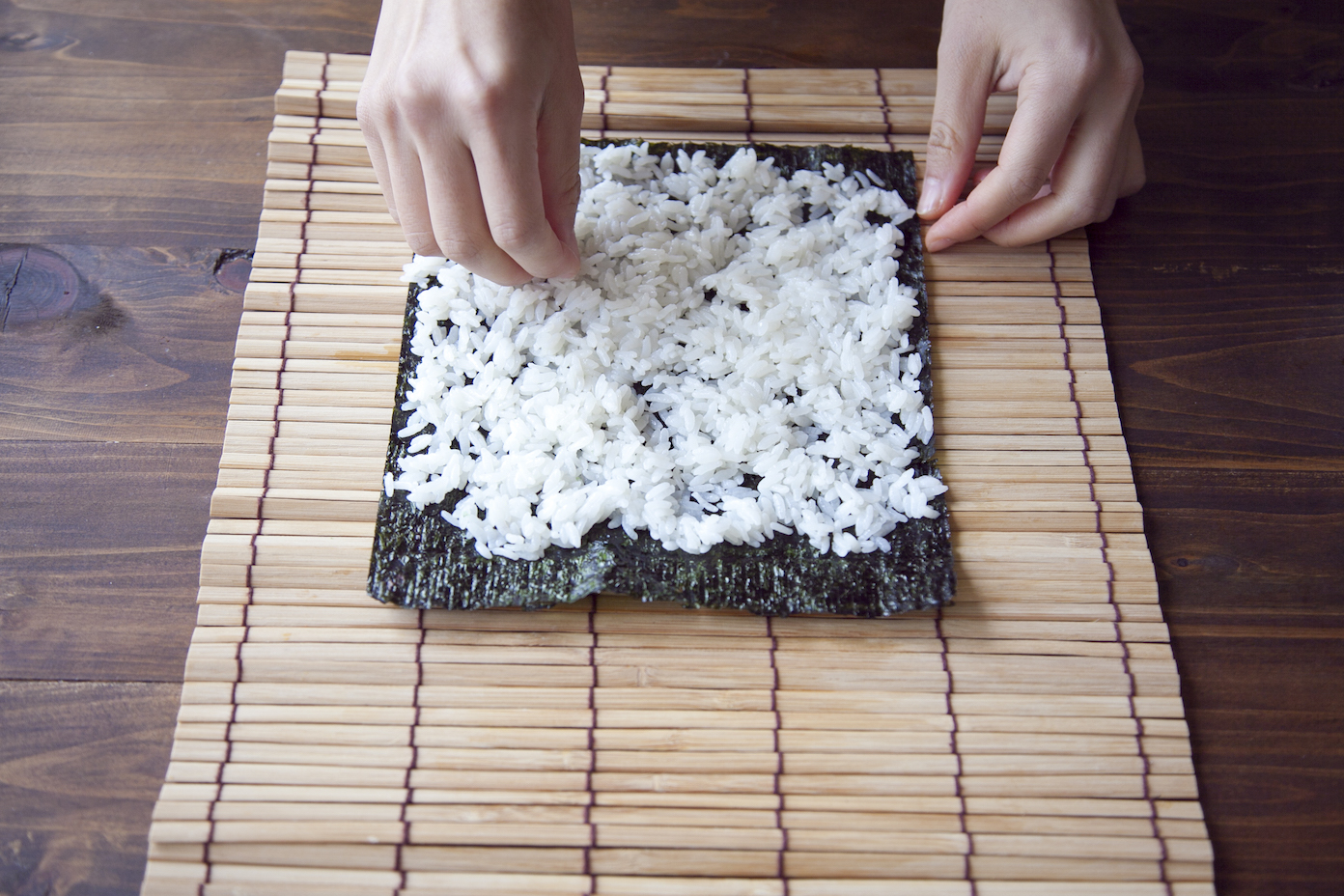 巻くとすし飯がぎゅっと締まるため、海苔がすける程度に薄めに敷きます。)