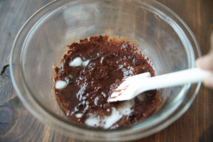 チョコレート、ココナッツオイルを加えて再びふんわりラップをし、電子レンジ600Wで30秒加熱し、よく混ぜてチョコレートを完全に溶かす。