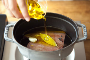 かぶる程度のオリーブオイルを注いで中火にかける。