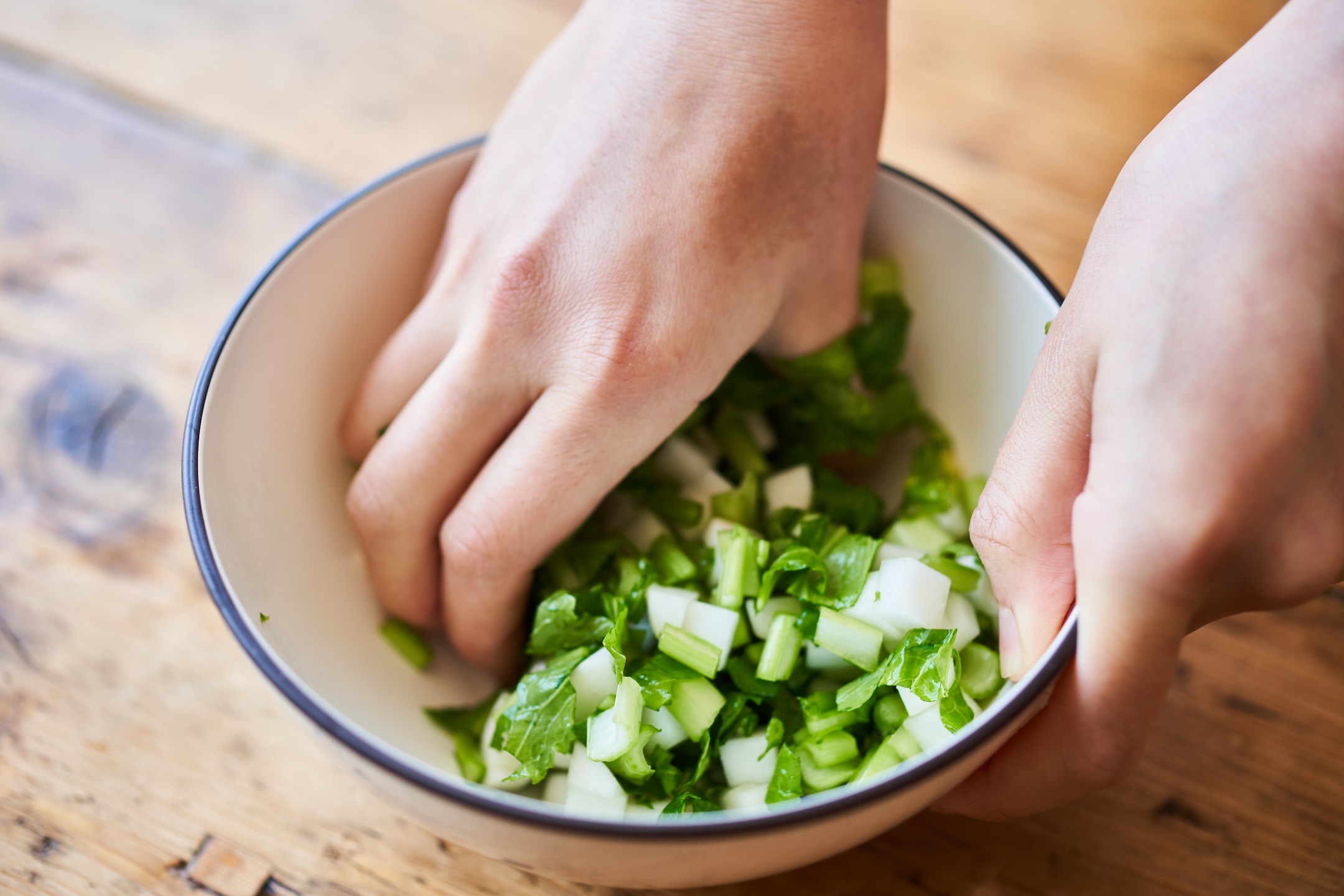かぶは根は皮ごと7mm角、葉は7mm幅に切り、塩をふって10分おいて絞る。