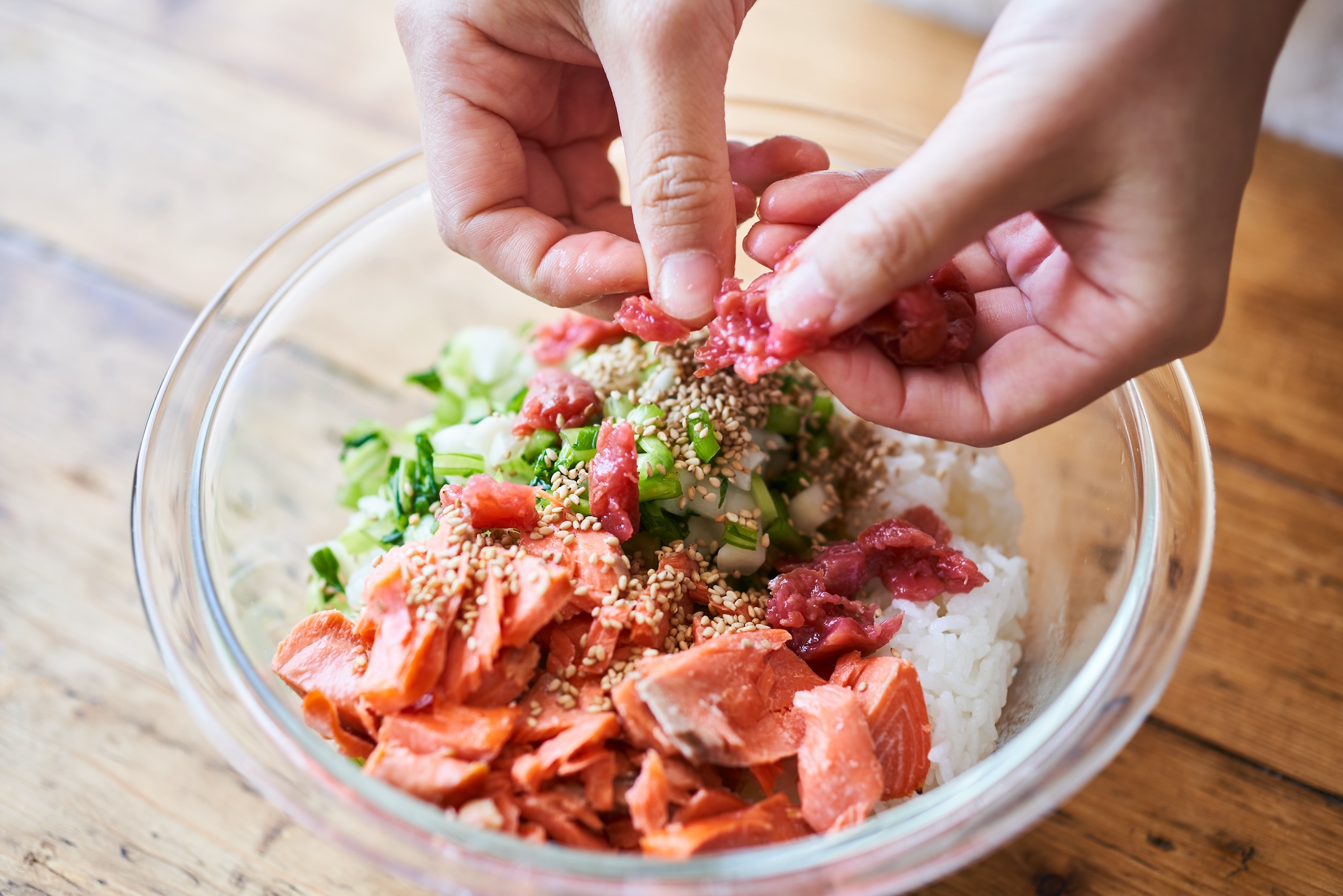 ご飯に1、2、ごま、ちぎった梅を混ぜ、1/4量ずつ握る。