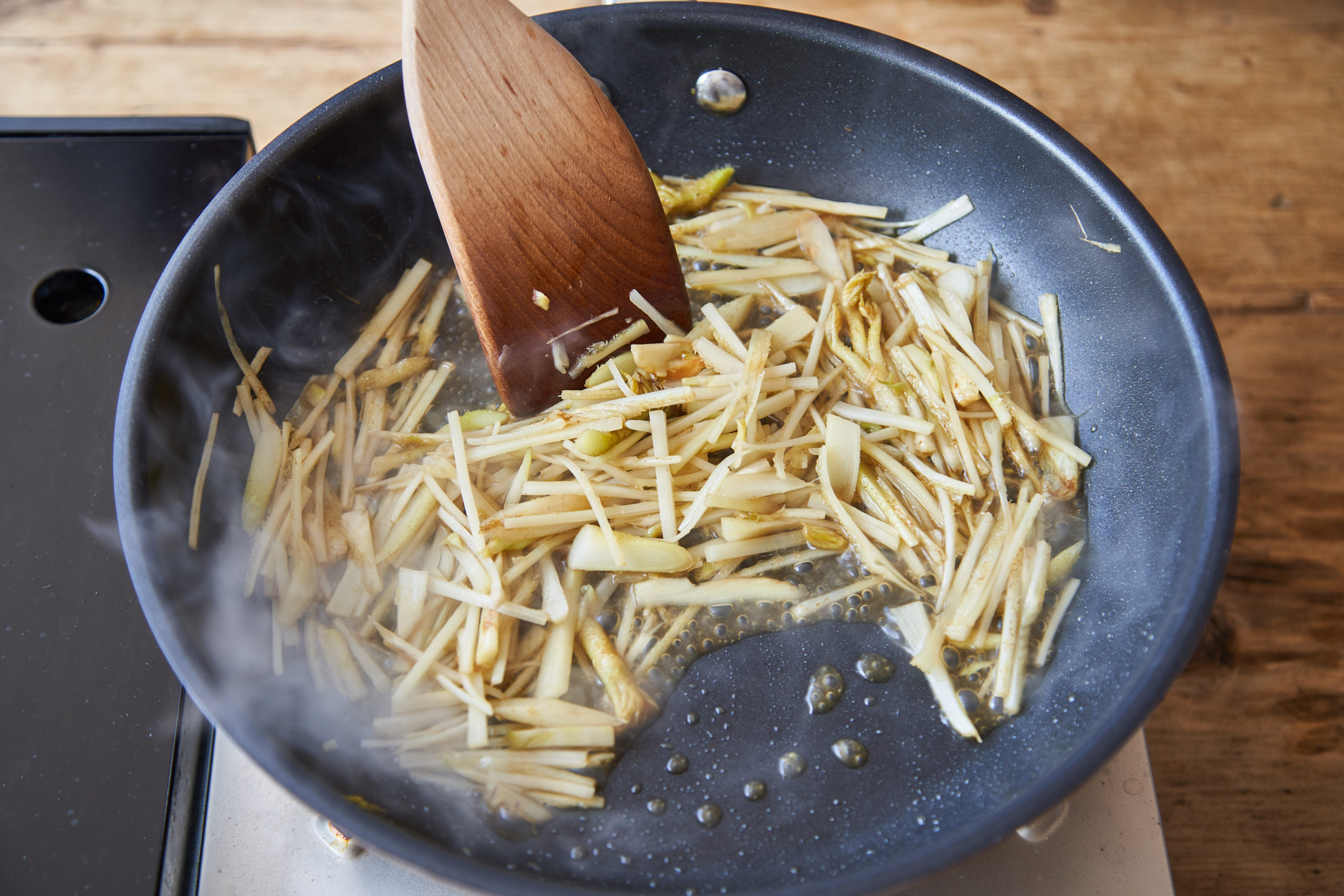 太い茎を使って残った、皮と穂先でつくる、きんぴらの作り方です。