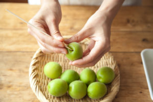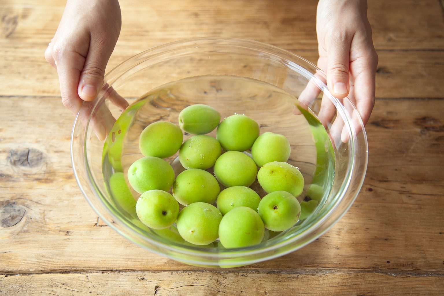 梅の水気を切り、ひとつずつ丁寧に水気を拭き取る。