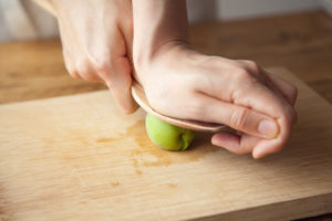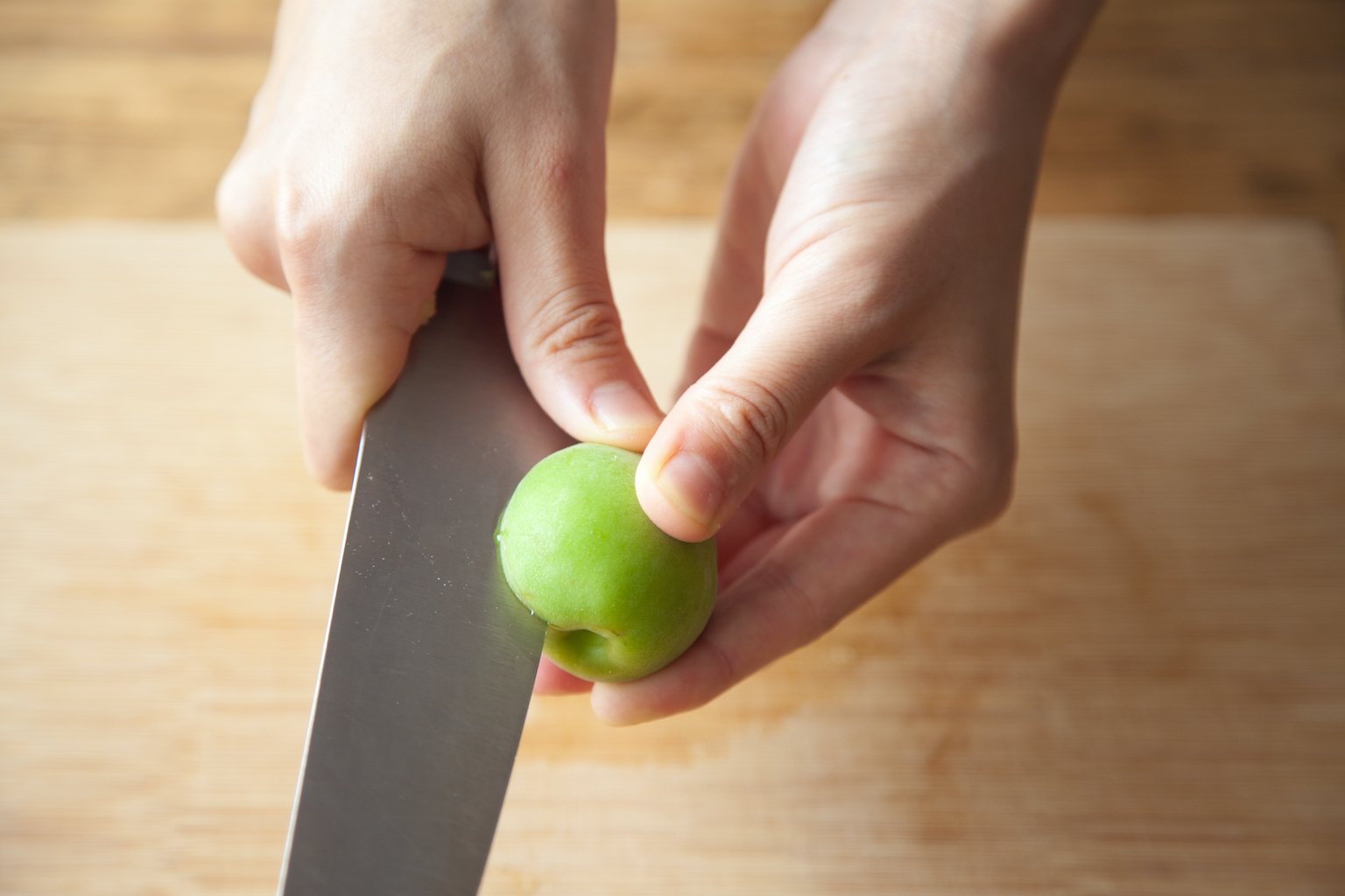木べらを押し当てて体重をかけ梅をわり、種を取り除く。