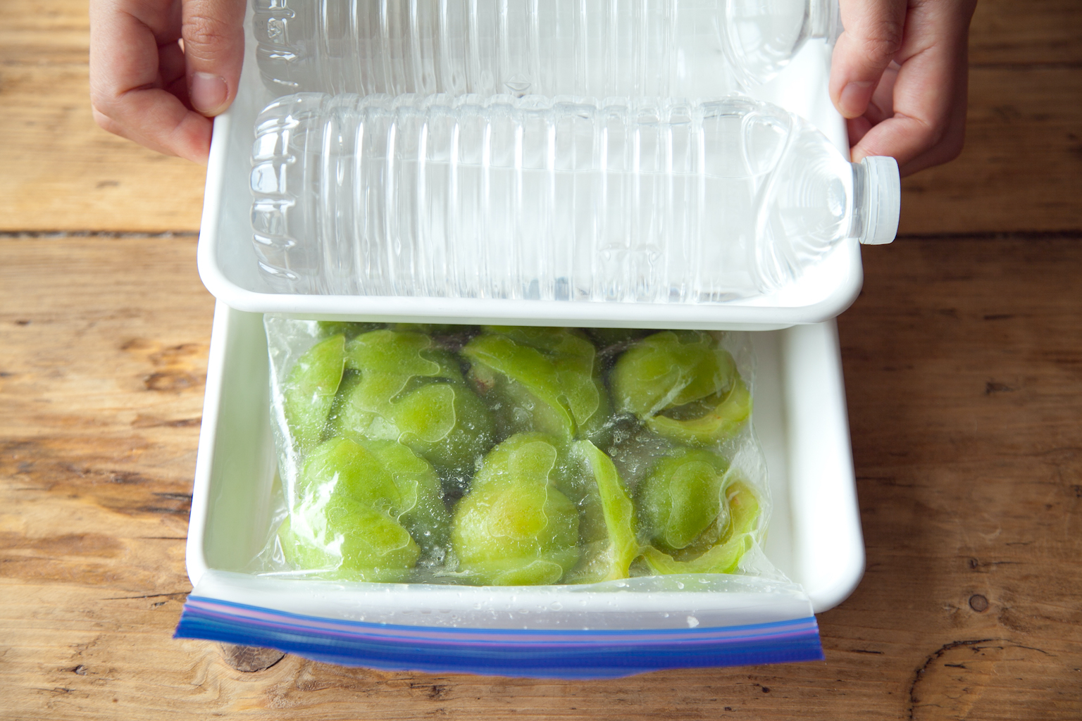 バットにのせて1kgの重石(500mlのペットボトル2本など)をのせ、1時間おく。