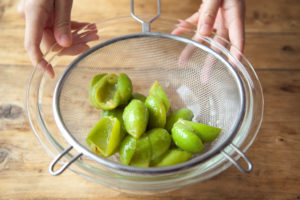梅をざるにあげ、キッチンペーパーで水気を軽く拭き取り、