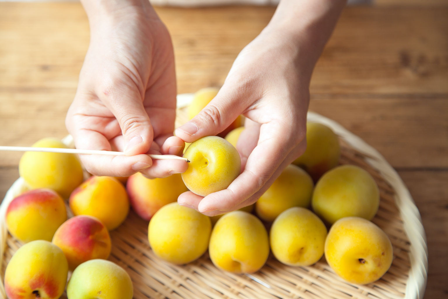 ボウルに水をはり、完熟梅をでやさしく洗う。