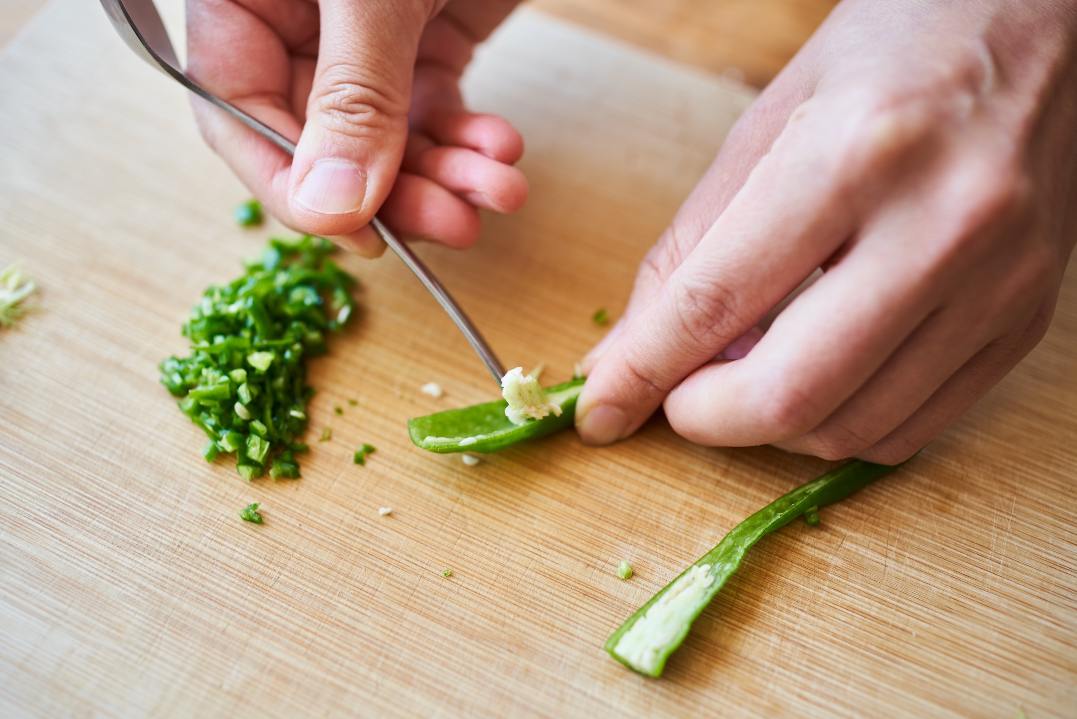 青唐辛子はヘタ、種を取り除いてみじん切りにする。