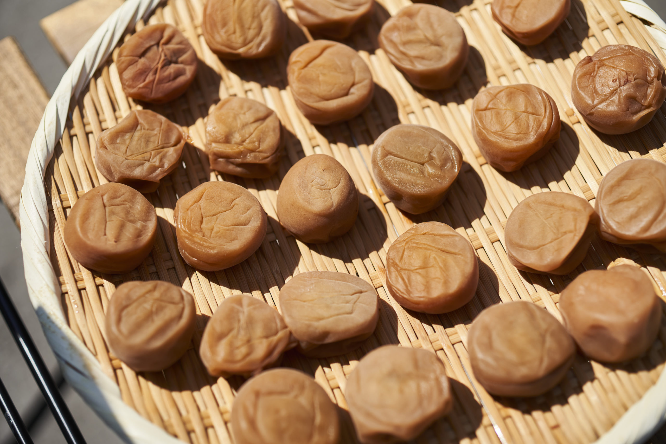 ざるに並べて天日干しをする。(※梅酢は取っておきます。)