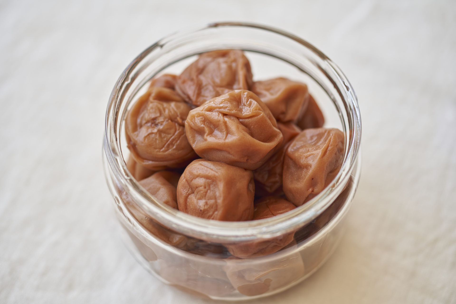 梅を梅酢にくぐらせてから清潔な瓶に入れて冷蔵庫で保存する。