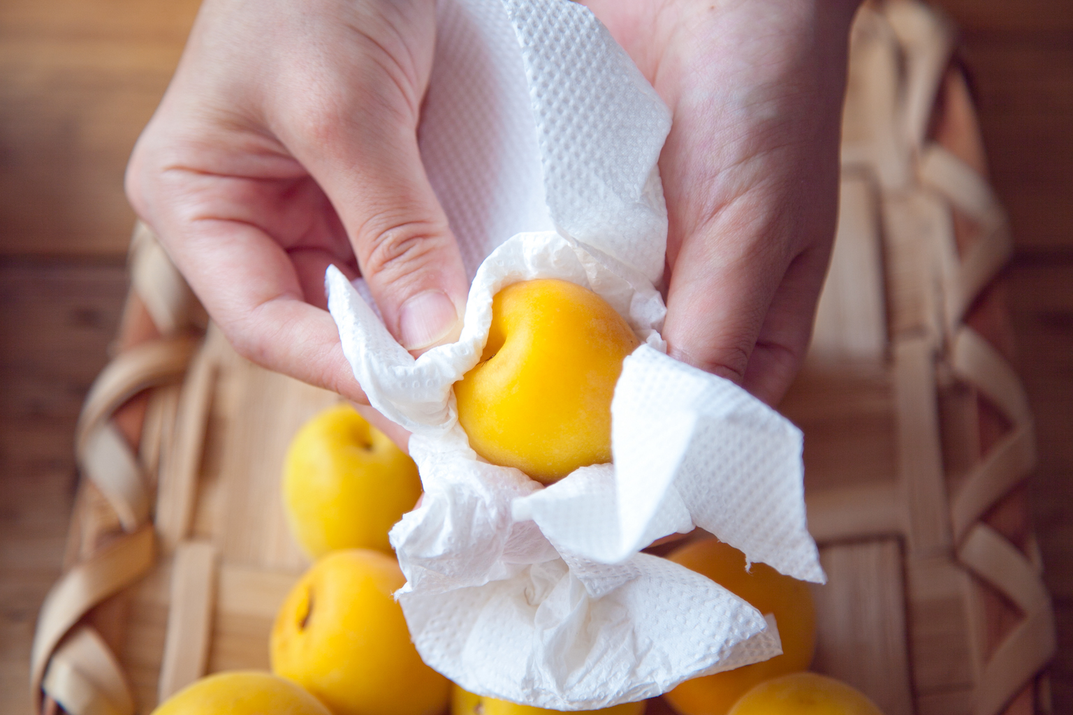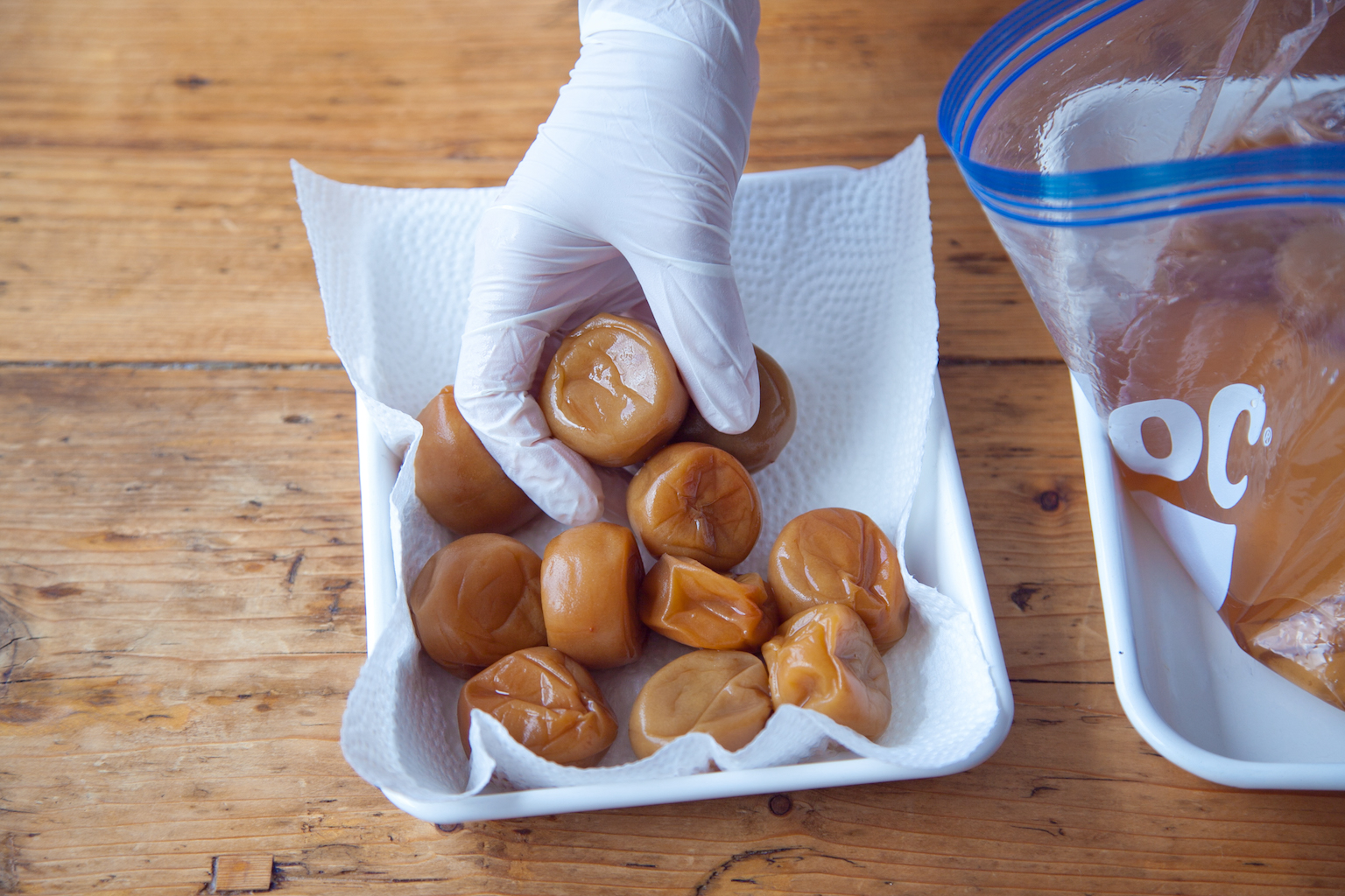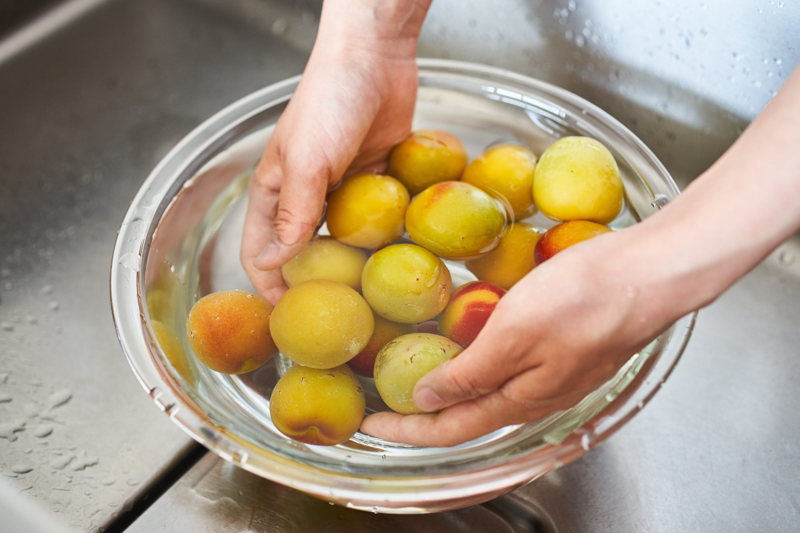 水をはったボウルに梅をいれてやさしく水洗いし、ざるにあげ、ひとつずつ丁寧に水気を拭き取る。