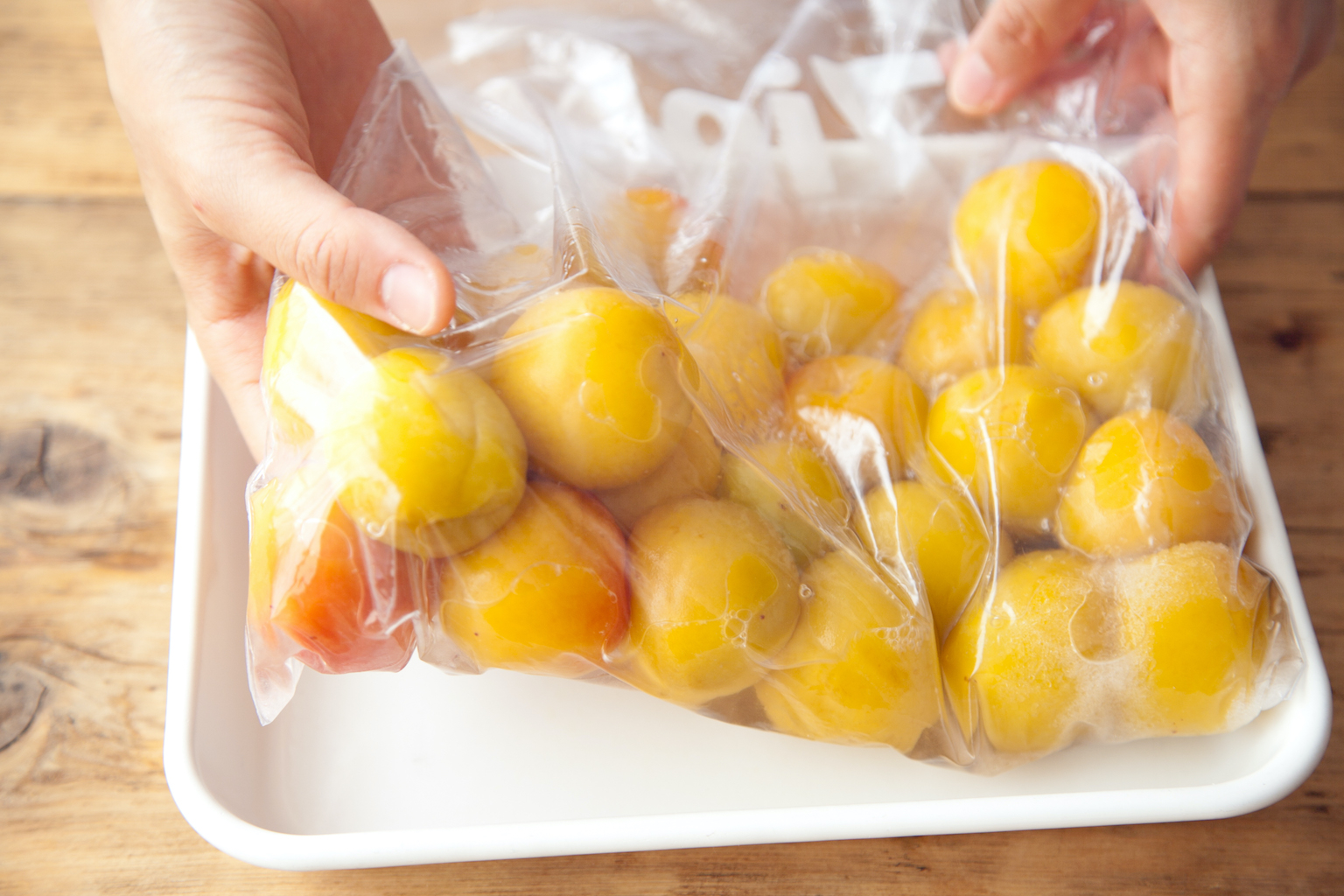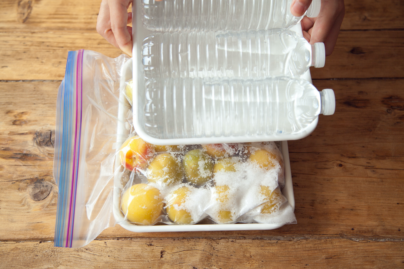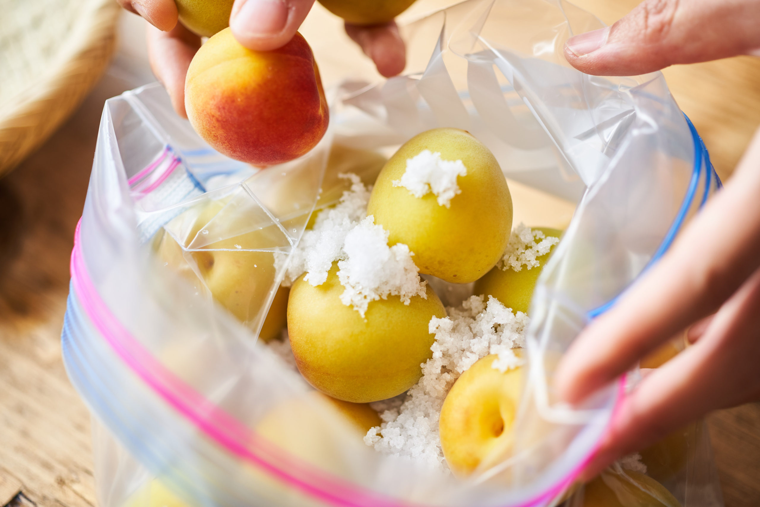 ジッパー付き保存袋に、梅、塩を交互に入れて、袋の上から全体を優しく揉む。