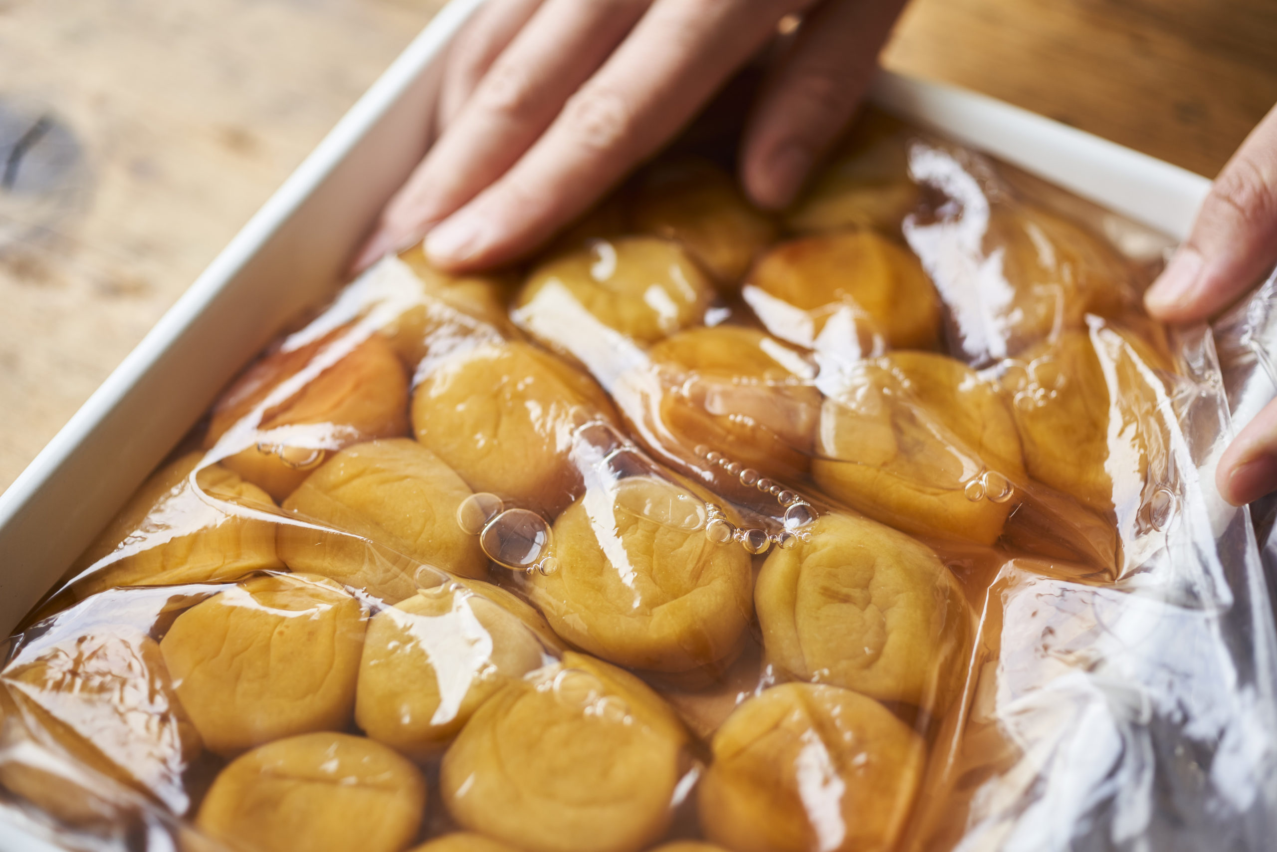 2〜3日すると梅酢(梅からでる水分)が上がってくる。
