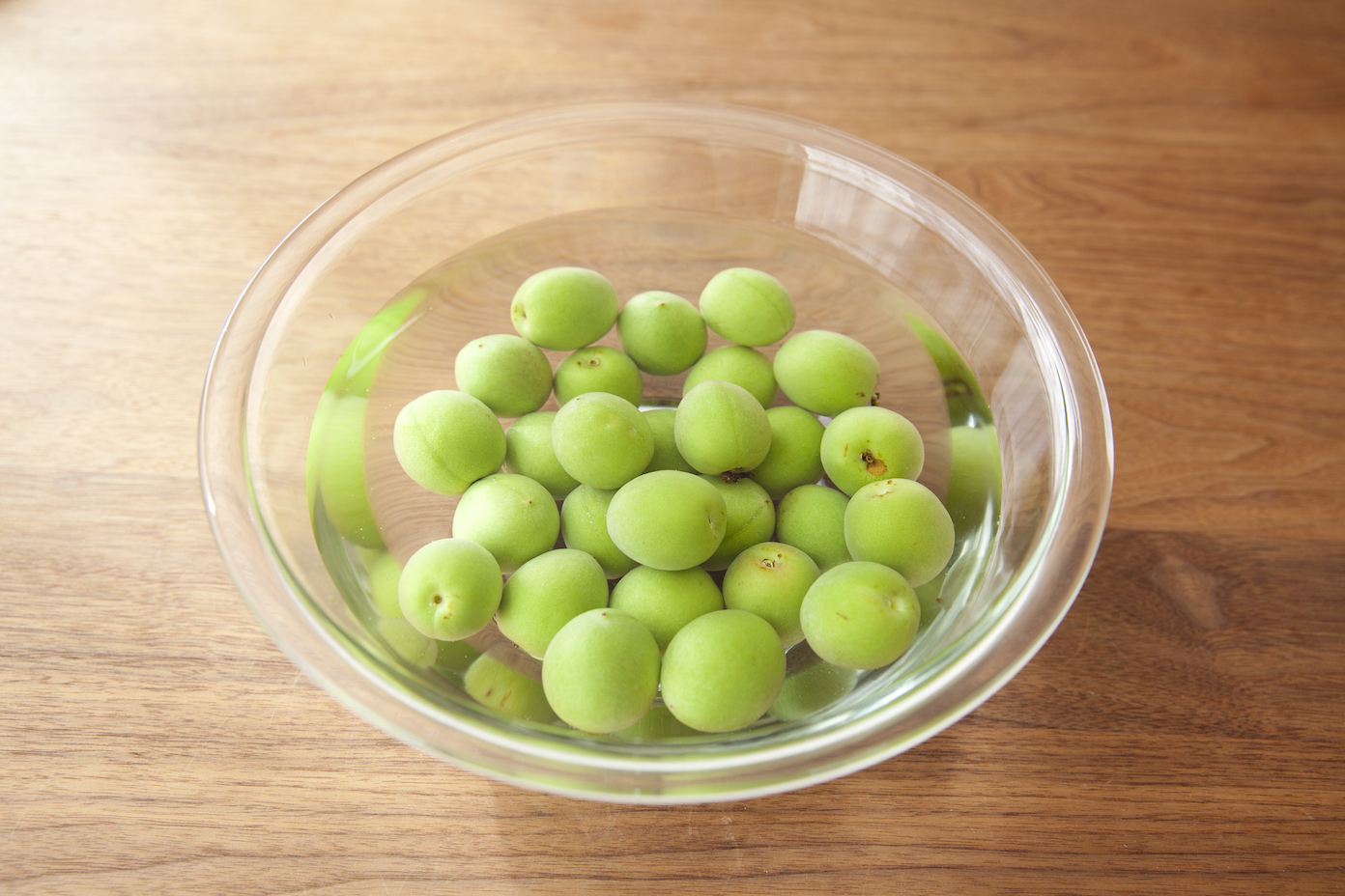 青梅は1時間程度水に浸してアクを除く。保存瓶はアルコールスプレーなどで消毒しておく。