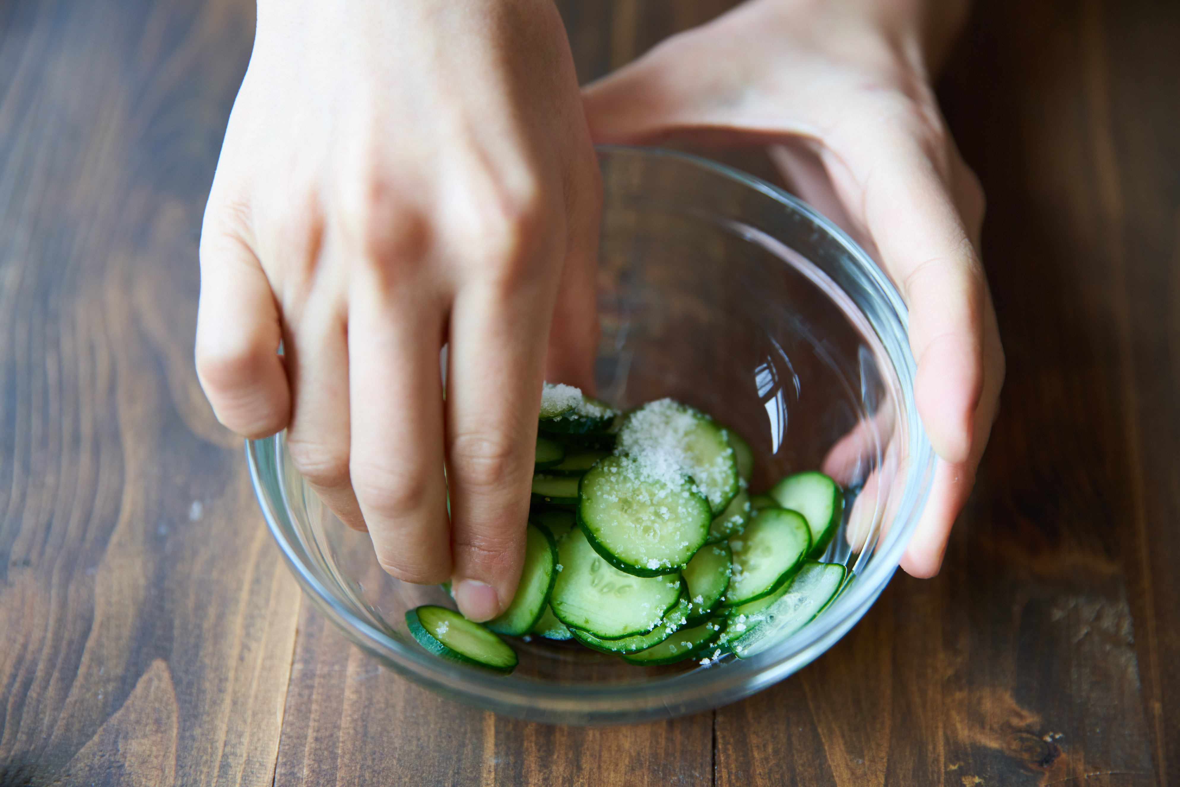 きゅうりは小口切りにして塩を揉み込み 5 分おいて水気を絞る。
