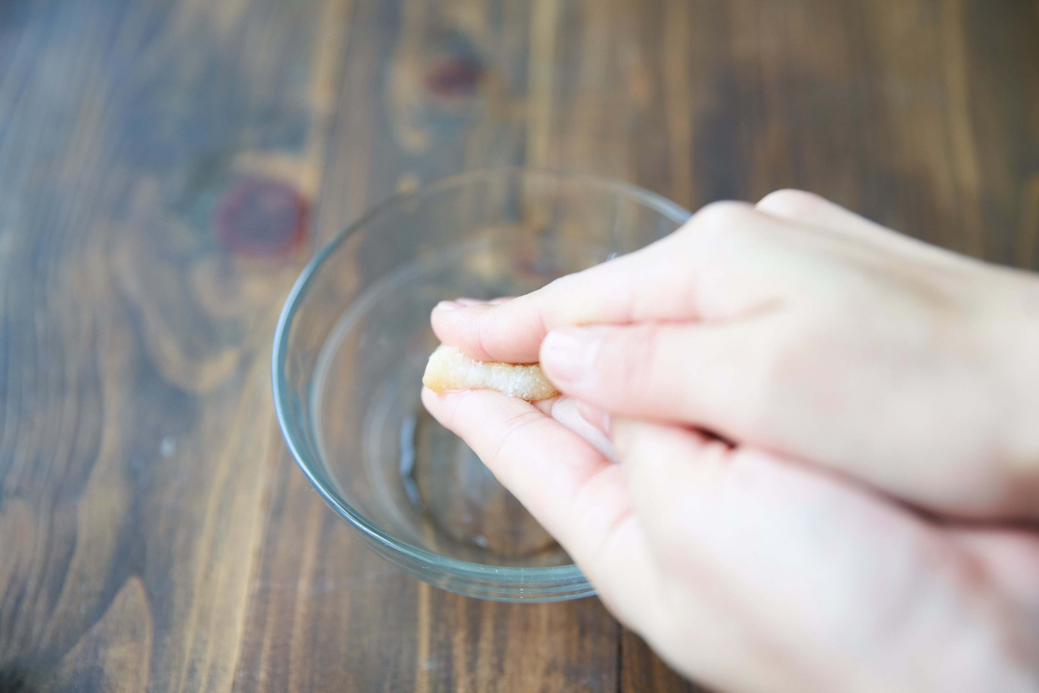 焼き麩は水で戻し、手で挟むようにしてしっかり水分を絞る。