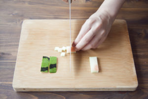 皮は1/4程度を使う。外側は取り除き、内側は5mm四方の角切りにし塩少々(分量外)で揉む。