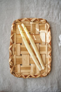 ホワイトアスパラは根元を2cmほど切り取り、 穂先の下から皮を剥く。