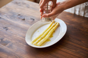 アスパラを器に盛り付け、オリーブオイル、 塩こしょうをかける。