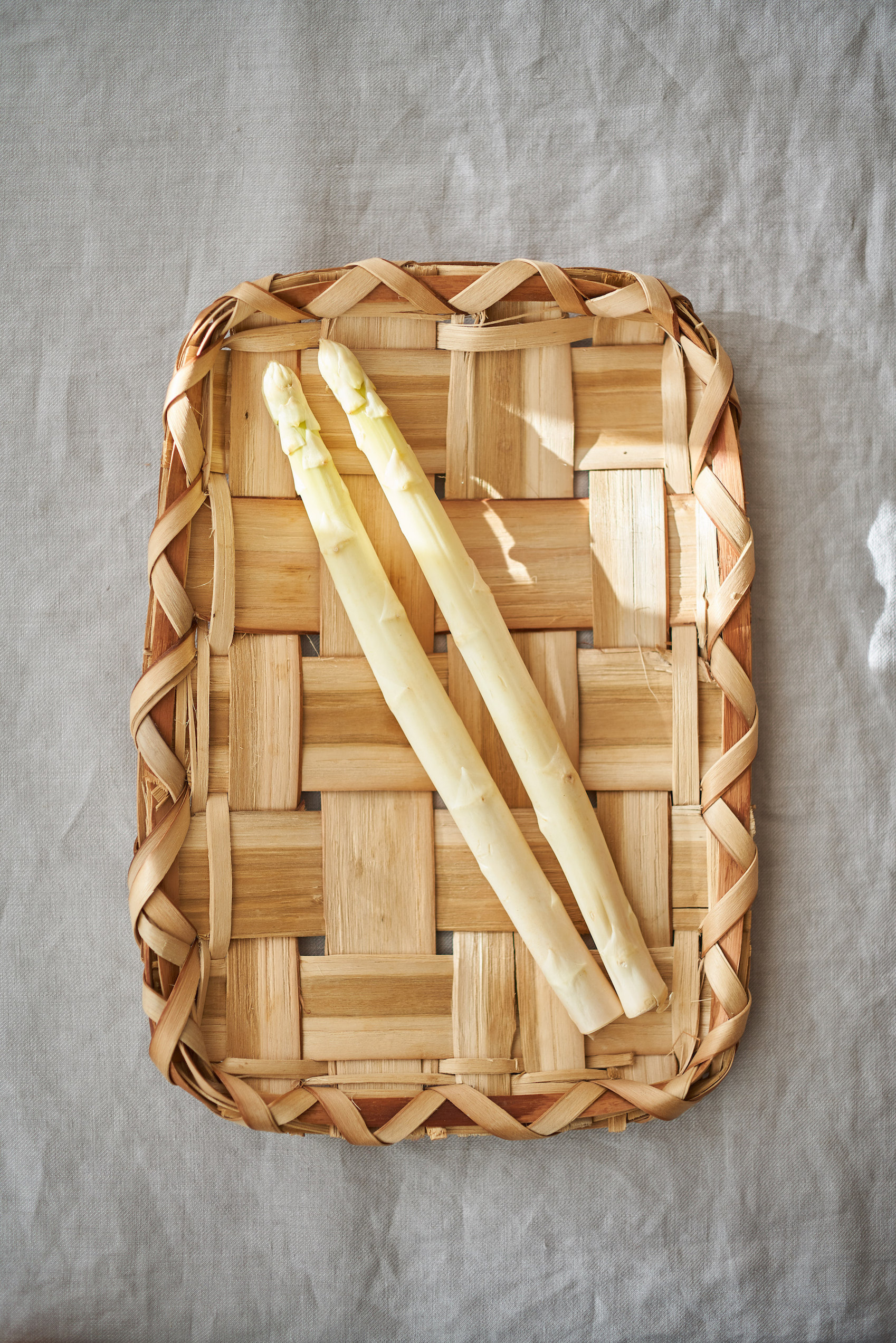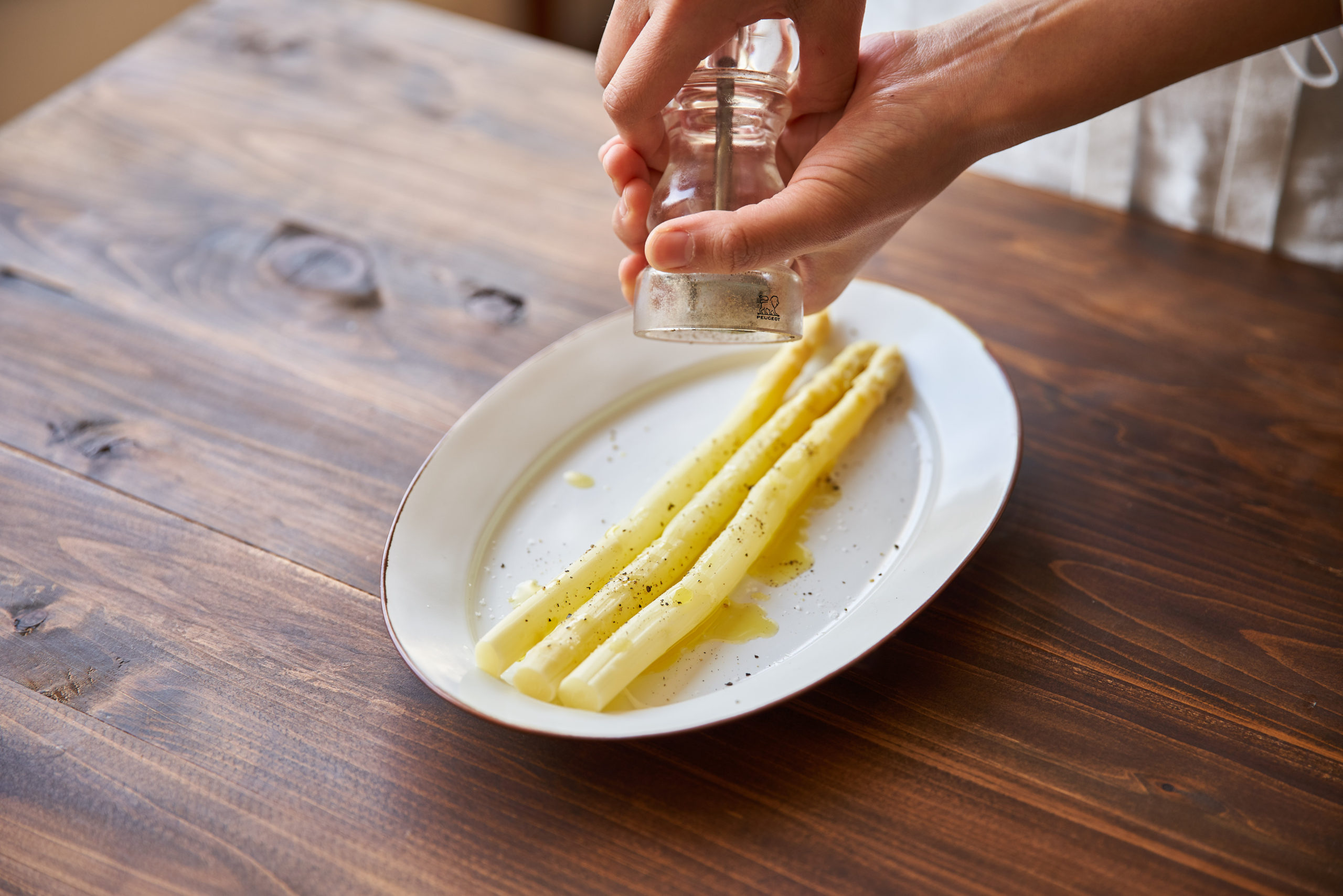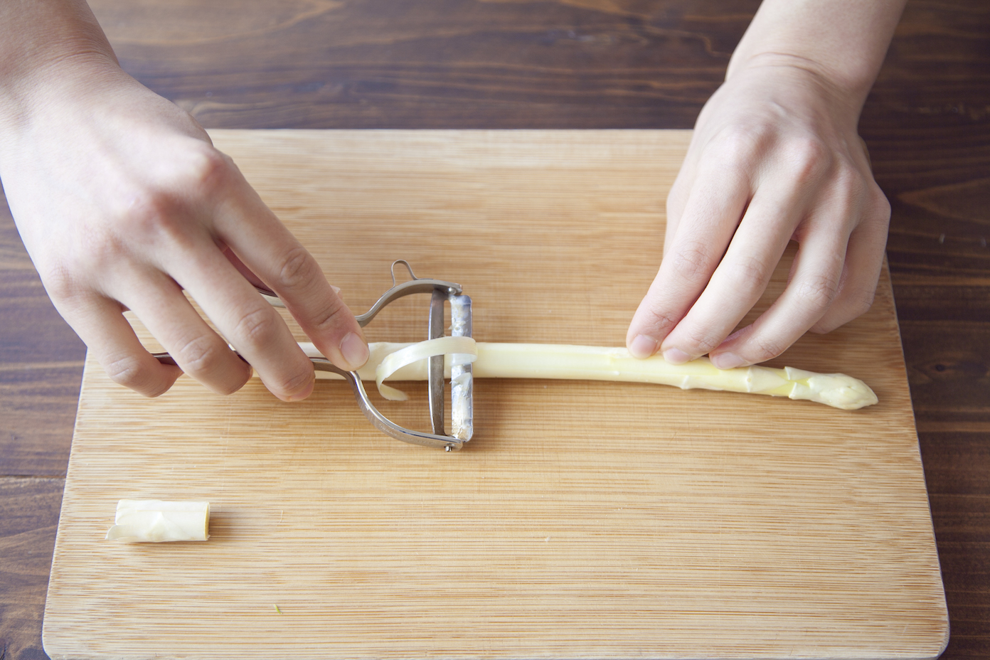 ホワイトアスパラは根元を2cmほど切り取り、 穂先の下から皮を剥く。