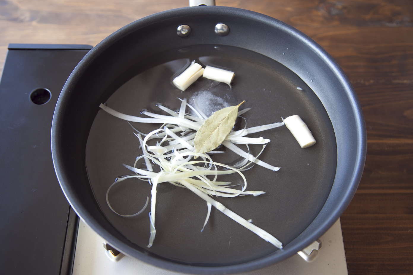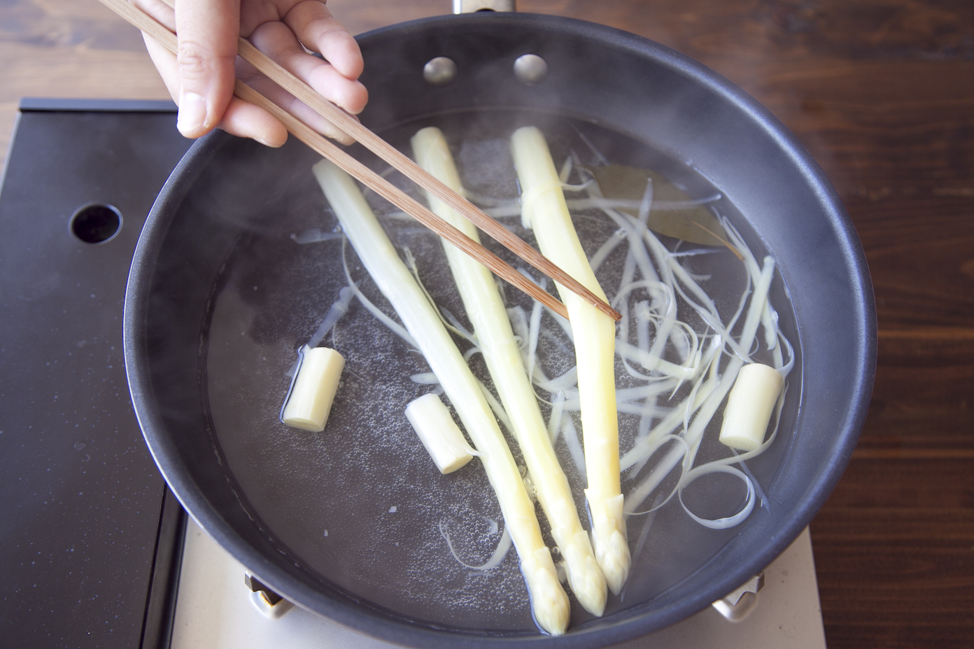 フライパンに水500ml、アスパラの根元、皮、塩、 レモン果汁、ローリエを入れて蓋をして中火にかける。