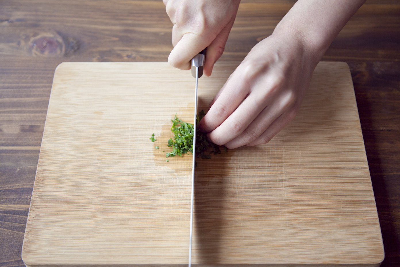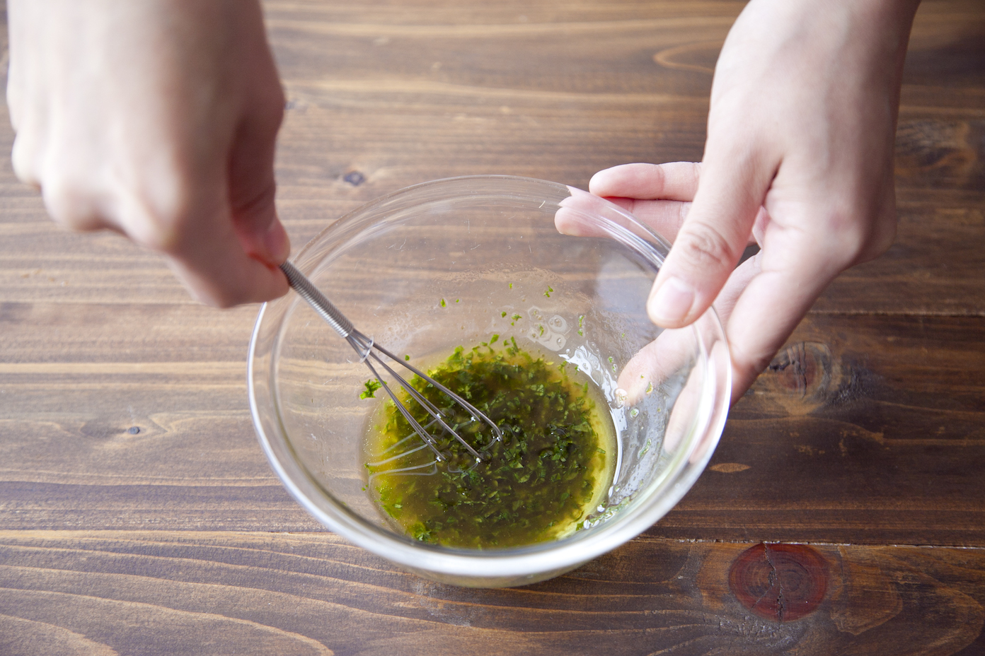 青じそは刻み、オリーブオイル(大さじ1と1/2)、薄口しょうゆ、にんにくと合わせてよく混ぜ、ソースにする。