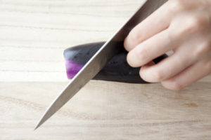 なすはヘタを切り落とし縦半分に切って皮目に切り込みを入れて、