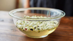 なす、きゅうりは5mm角程度、みょうが、青じそは刻む。