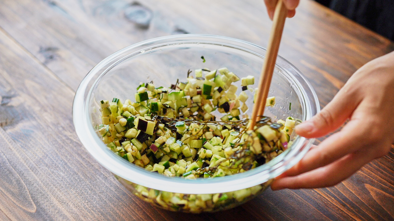 きゅうりやなすの夏野菜と薬味を刻んで混ぜるだけ、