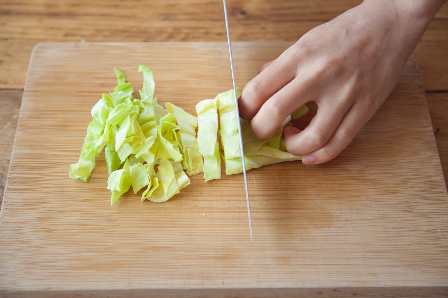 キャベツは食べやすい長さの1.5cm幅に、芯の部分は斜め薄切りにする。