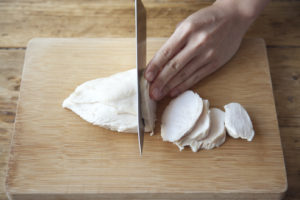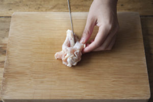 鶏手羽元は骨に沿って切り込みをいれる。鶏むね肉に粗塩を揉み込む。
