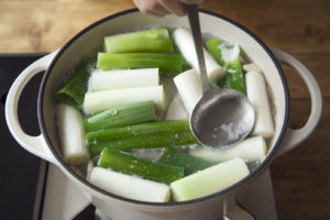 沸いたらアクをとり、弱火にしてふつふつと弱い沸騰状態を保つ。