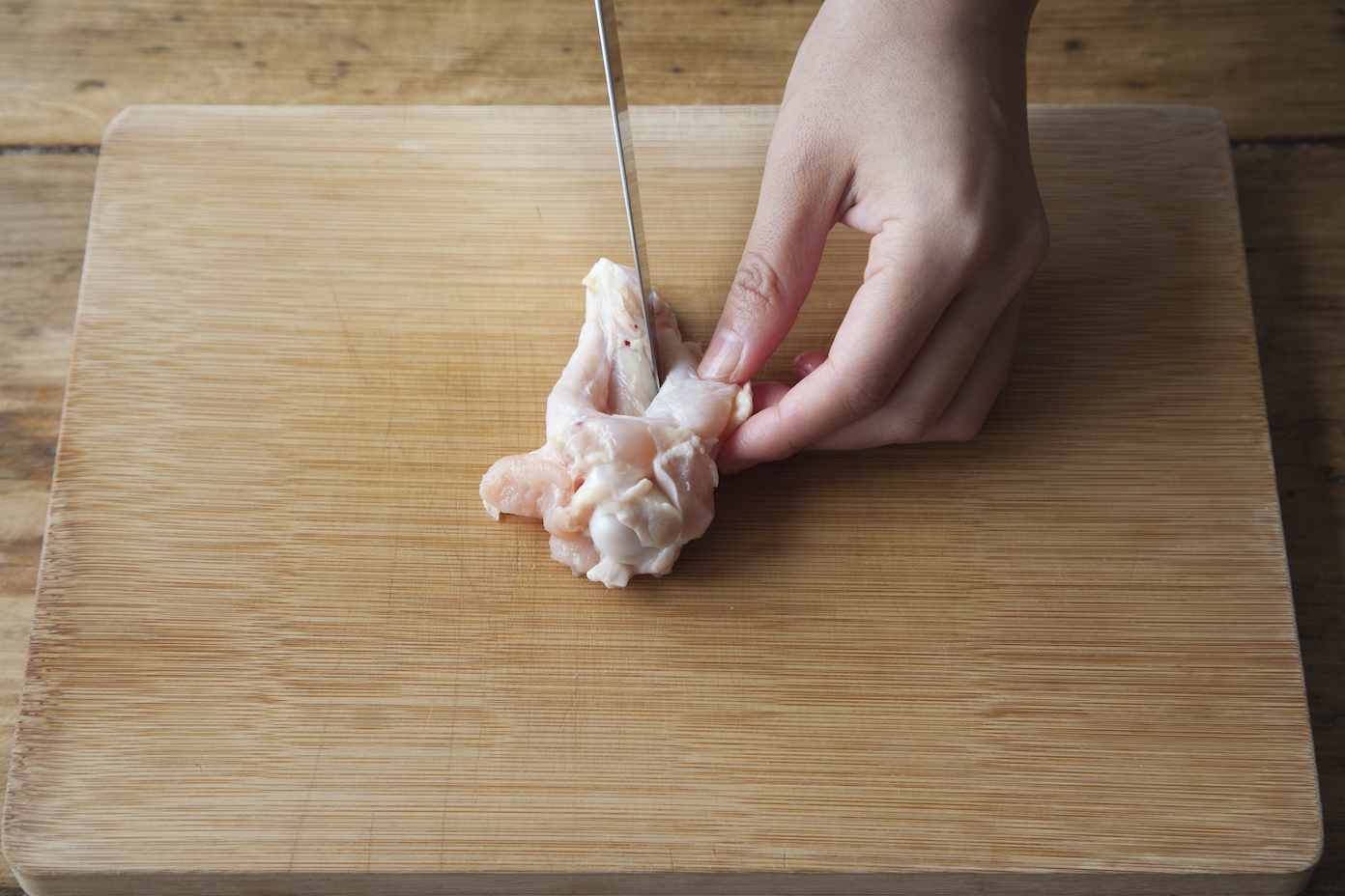 鶏手羽元は骨に沿って切り込みをいれる。鶏むね肉に粗塩を揉み込む。