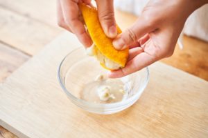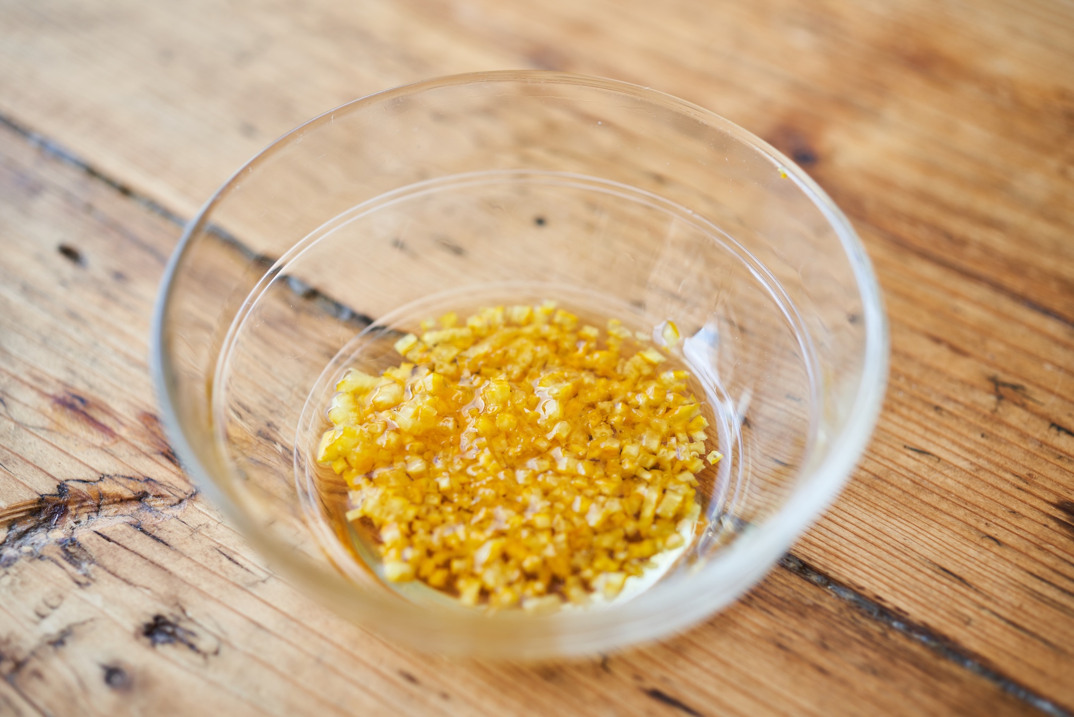 耐熱皿にみりん、1のゆず皮を入れ、ラップをかけずに、電子レンジ600Wで40〜50秒加熱する。